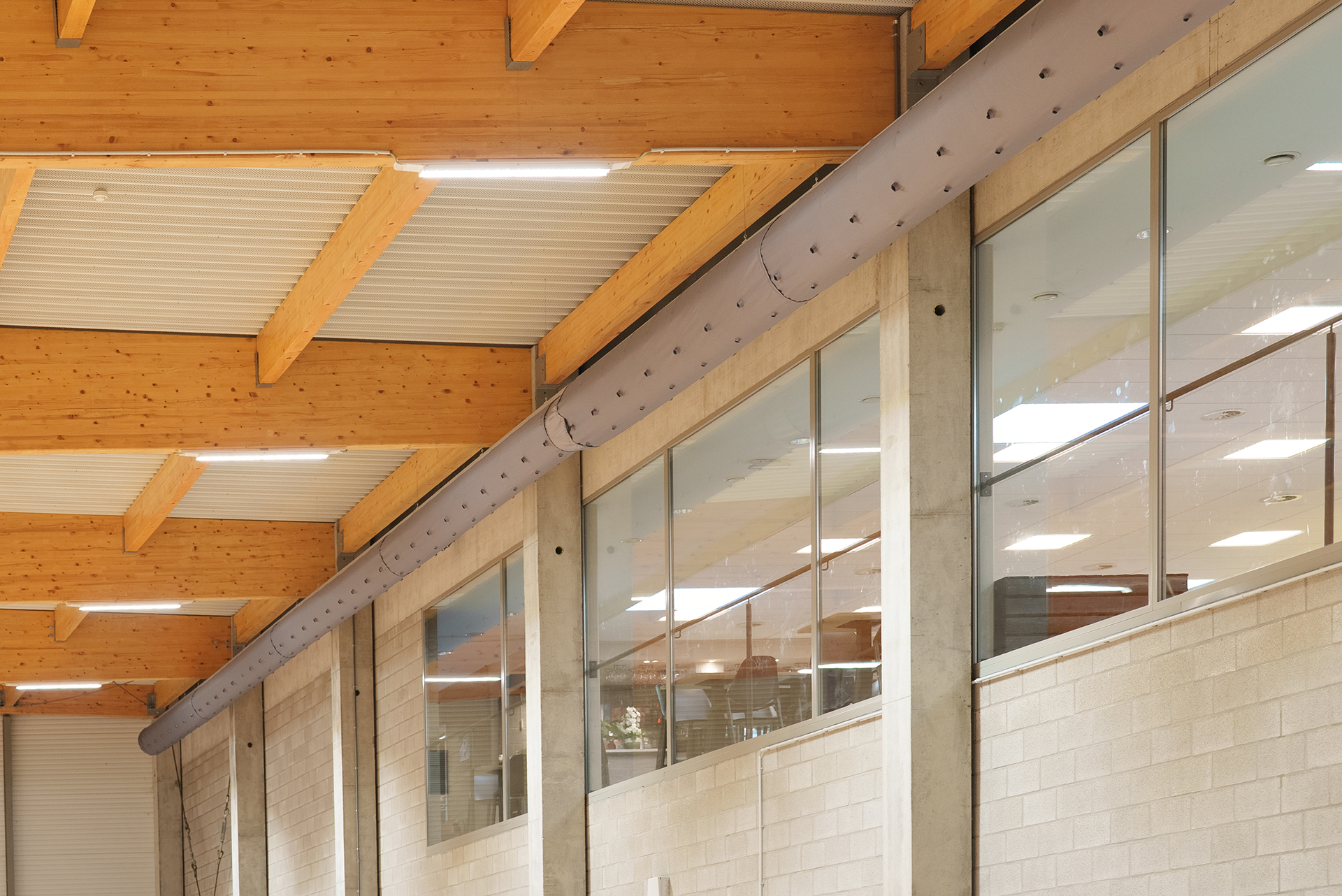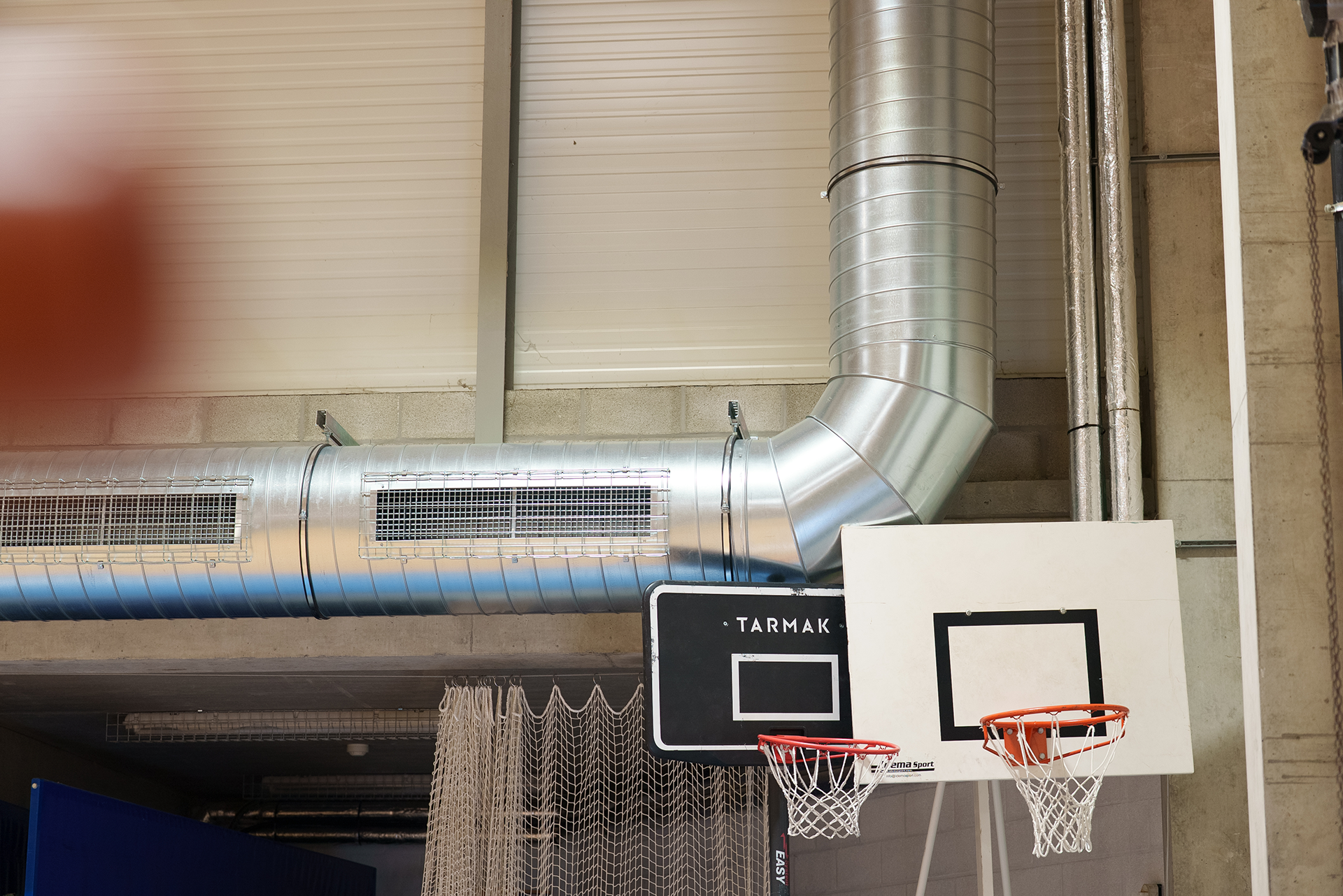 - La distribution de la chaleur s'effectue via 20 ventilo-convecteurs et des conduits d'air textiles qui permettent une régulation uniforme et confortable de la température dans les zones sportives et annexes.
